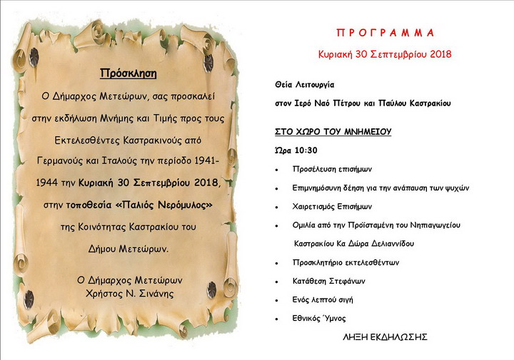 Ο Δήμαρχος Μετεώρων, σας προσκαλεί στην εκδήλωση Μνήμης και Τιμής προς τους Εκτελεσθέντες Καστρακινούς από Γερμανούς και Ιταλούς την περίοδο 1941- 1944 την Κυριακή 30 Σεπτεμβρίου 2018, στην τοποθεσία «Παλιός Νερόμυλος» της Κοινότητας Καστρακίου του Δήμου Μετεώρων.