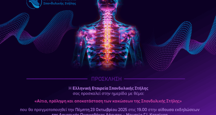 Στην Αίθουσα της Δημοτικής Πινακοθήκης – Μουσείο Γ.Ι. Κατσίγρα θα πραγματοποιηθεί την Πέμπτη 23 Οκτωβρίου η ενημερωτική εκδήλωση της Ελληνικής Εταιρείας Σπονδυλικής Στήλης για τα αίτια, τις πολιτικές πρόληψης και την αποκατάσταση των κακώσεων της Σπονδυλικής Στήλης. Η εκδήλωση που είναι ανοικτή στο κοινό, θα ξεκινήσει στις 7 το απόγευμα και φιλοδοξεί να φωτίσει τα αίτια που προκαλούν τις κακώσεις της σπονδυλικής στήλης και στις περισσότερες περιπτώσεις σχετίζονται με το μοτίβο των αστικών μετακινήσεων. Ωστόσο θα παρουσιαστούν επίσης οι σύγχρονες πρακτικές αντιμετώπισης και αποκατάστασης των σχετικών τραυμάτων, αλλά και οι πολιτικές πρόληψης.