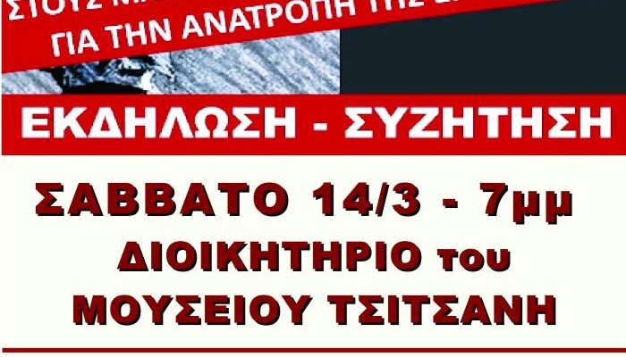 Οι Αγωνιστικές Κινήσεις Εκπαιδευτικών διοργανώνουν εκδήλωση-συζήτηση με αφορμή τις συνδικαλιστικές διώξεις στο χώρο της εκπαίδευσης, το Σάββατο 14/3 στις 7:00 μμ στην αίθουσα του Διοικητηρίου στο μουσείο Τσιτσάνη με ομιλητές τον Κώστα Μιχαλάκη (μέλος ΔΣ της ΕΛΜΕ) και τον Δημήτρη Χαρτζουλάκη (διωκόμενο εκπαιδευτικό).