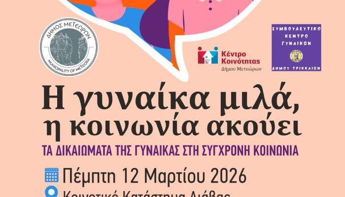 Το Κέντρο Κοινότητας του Δήμου Μετεώρων, σε συνδιοργάνωση με το Συμβουλευτικό Κέντρο Γυναικών Τρικάλων, με αφορμή την Παγκόσμια Ημέρα της Γυναίκας (8 Μαρτίου), σας προσκαλούν στην εκδήλωση με θέμα:
