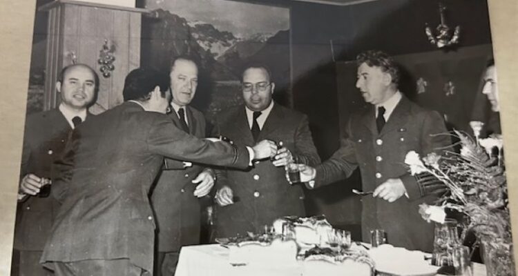 Ανάμεσά τους ο πατέρας μου, Χρυσόστομος Λιάπης, Υποσμηναγός -τότε- (Τ/Η). Η τεχνητή νοημοσύνη πάλι έκανε την τεχνο-εννοιολογική, ψηφιακή μετωνυμία της, εμφανίζοντας, στο δεξί άκρο της φωτογραφίας, εκεί που στην πραγματικότητα υπήρχε ένα ανθοδοχείο και το -μόλις διακρινόμενο- πρόσωπο ενός αεροπόρου, ένα περίεργο, αλλοσούσουμο ζωόμορφο ον, με τις γούνινες προεξοχές του να αποτυπώνουν την ψηφιακή επεξεργασία των αγκαθερών βλαστών της ανθοδέσμης που κοσμούσε εκείνη την Πρωτοχρονιά το τραπέζι των αεροπόρων που τρώνε τη γλυκιά βασιλόπιτα και τσουγκρίζουν τα ποτήρια τους, ενώ τελευταίο, περιμένει να σερβιριστεί αυτό το περίεργο απείκασμα της Α.Ι., λες και πρόκειται για μία τεχνολογική αλληγορία της “ψυχής του ηγέτη” που κατά τον Sinek “τρώει τελευταίος”. Αυτό το απεικονιστικό αλλομερές του ηγέτη που με εξωστομένη την οδοντοστοιχία της κάτω γνάθου του τιθασεύει τη λαιμαργία του, προς όφελος του κοινού καλού, περιμένοντας, δίπλα στον πατέρα μου, να φάει τελευταίος, μετά τους άντρες του…»