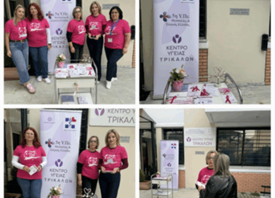 Την Τρίτη 21 Οκτώβριου οι Μαίες του Κέντρου Υγείας Τρικάλων πραγματοποίησαν ενημερωτική δράση αναφορικά με την Πρόληψη του Καρκίνου του Μαστού. Οι γυναίκες ενημερώθηκαν σχετικά με το είδος των παρεχόμενων εξετάσεων, την διαδικασία πραγματοποίησης των εξετάσεων, την αυτοεξέταση του μαστού και διανεμήθηκε έντυπο υλικό.