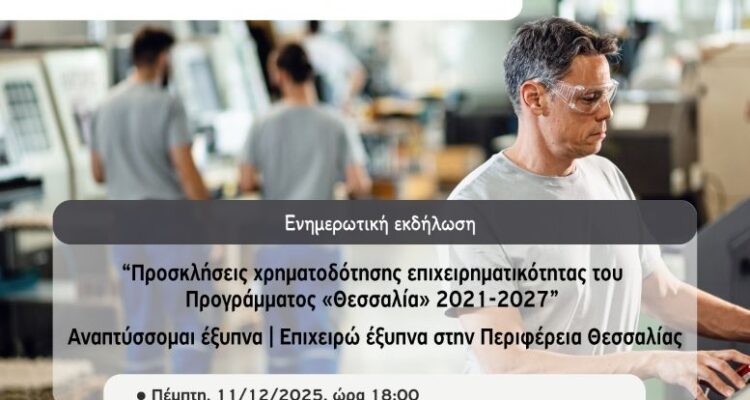 Το Επιμελητήριο Τρικάλων και η Περιφέρεια Θεσσαλίας διοργανώνουν ανοιχτή ενημερωτική εκδήλωση με θέμα: “Προσκλήσεις χρηματοδότησης επιχειρηματικότητας του Προγράμματος «Θεσσαλία» 2021-2027”, την Πέμπτη 11 Δεκεμβρίου 2025 και ώρα 18:00, στην αίθουσα εκδηλώσεων του Επιμελητηρίου Τρικάλων (Βενιζέλου 1, Τρίκαλα).