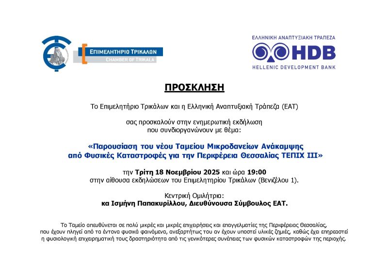 Το Επιμελητήριο Τρικάλων και η Ελληνική Αναπτυξιακή Τράπεζα (EAT) προσκαλούν όλους τους επιχειρηματίες στην ανοιχτή ενημερωτική εκδήλωση που συνδιοργανώνουν με θέμα: «Παρουσίαση του νέου Ταμείου Μικροδανείων Ανάκαμψης από Φυσικές Καταστροφές για την Περιφέρεια Θεσσαλίας ΤΕΠΙΧ ΙΙΙ». Η εκδήλωση θα πραγματοποιηθεί την Τρίτη 18 Νοεμβρίου 2025 και ώρα 19:00 στην αίθουσα εκδηλώσεων του Επιμελητηρίου Τρικάλων (Βενιζέλου 1).