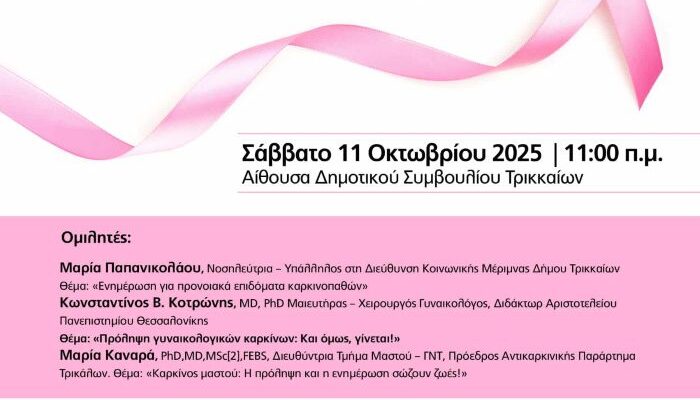 Η Ελληνική Αντικαρκινική Εταιρεία – Παράρτημα Τρικάλων διοργανώνει το Σάββατο 11 Οκτωβρίου και ώρα 11:00 π.μ. στην αίθουσα του Δημοτικού Συμβουλίου του Δήμου Τρικκαίων