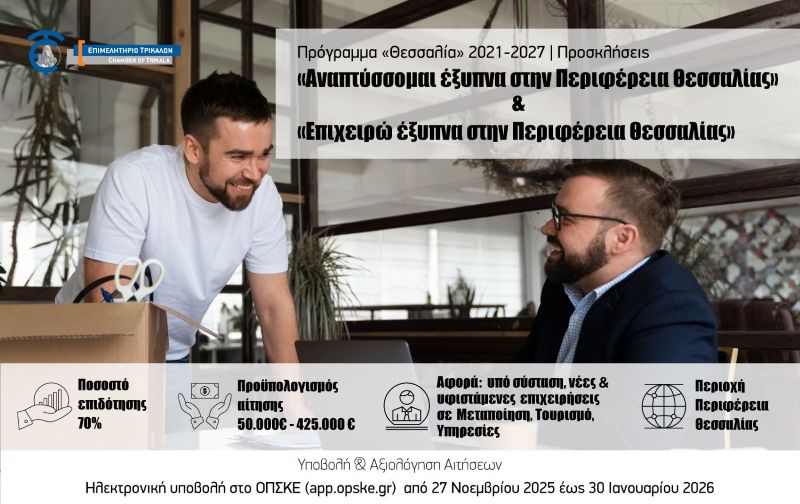 Το Επιμελητήριο Τρικάλων ενημερώνει για τη δημοσίευση των νέων Προσκλήσεων της Περιφέρειας Θεσσαλίας, «Επιχειρώ έξυπνα στην Περιφέρεια Θεσσαλίας» και «Αναπτύσσομαι έξυπνα στην Περιφέρεια Θεσσαλίας» στο πλαίσιο του Προγράμματος «Θεσσαλία» 2021-2027, με συνολική δημόσια δαπάνη ποσού 20.000.000€ έκαστος και με τη συγχρηματοδότηση από το Ευρωπαϊκό Ταμείο Περιφερειακής Ανάπτυξης (ΕΤΠΑ) της Ευρωπαϊκής Ένωσης και από Εθνική Συμμετοχή.
