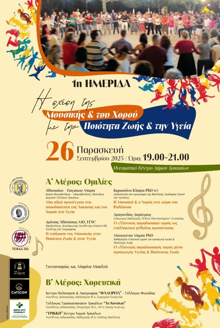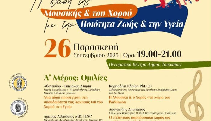 Ποια η σχέση υγείας και μουσικής; Υπάρχουν επιστημονικά ευρήματα για αυτό; Μπορούμε να γυμναστούμε με το χορό αλλά και να βοηθηθούμε σε παθήσεις όπως το Parkinson; Απαντήσεις σε αυτά και σε άλλα ζητήματα που αφορούν στη σχέση Υγείας, Μουσικής και Χορού θα δοθούν από τους/τις ομιλητές/τριες της ημερίδας με τίτλο «Η Σχέση της Μουσικής & του Χορού με την Ποιότητα Ζωής & την Υγεία».