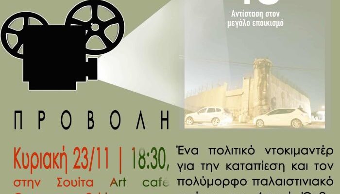 Η Επιτροπή Αλληλεγγύης στον Παλαιστινιακό λαό στο πλαίσιο συνέχισης των δράσεων ενημέρωσης και κινητοποίησης του Τρικαλινού λαού για τον αγώνα που δίνει ο λαός της Παλαιστίνης, προβάλει την ταινία “’48 – Αντίσταση στον μεγάλο εποικισμό” την Κυριακή 23/11 στις 6:30 μμ στη Σουίτα Art cafe.