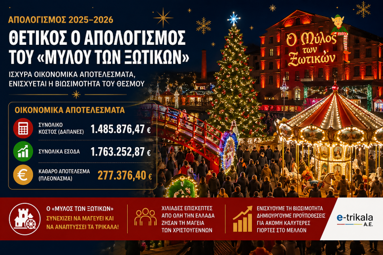Ο απολογισμός για τον «Μύλος των Ξωτικών» την περίοδο 2025–2026 δείχνει ότι ο θεσμός όχι μόνο διατηρεί τη δυναμική του, αλλά εξακολουθεί να αποτελεί βασικό πυλώνα του εορταστικού τουρισμού στην Τρίκαλα.