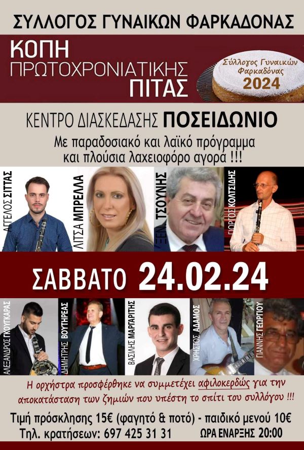 Τον ετήσιο χορό του πραγματοποιεί αυτό το Σάββατο ο Συλλόγος Γυναικών Φαρκαδόνας. Για μια βραδιά γεμάτη κέφι και χορό με πλούσιο λαικοδημοτικό πρόγραμμα από εξαιρετικούς μουσικούς!