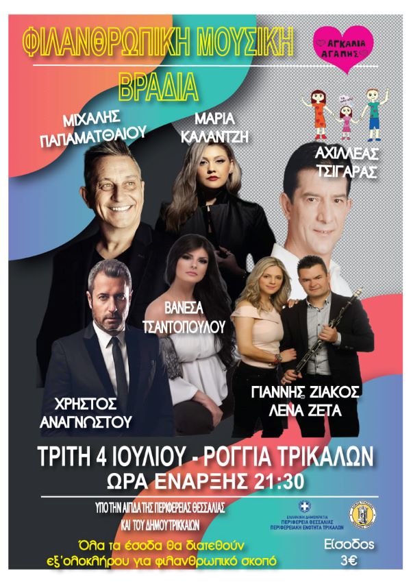 Φιλανθρωπική μουσική βραδιά από τον Σύλλογο “Αγκαλιά Αγάπης” 29/06/2023 Τοπικά - Θεσσαλικά Δημήτρης Παδιός Φιλανθρωπική μουσική βραδιά την Τρίτη 4 Ιουλίου από τον Σύλλογο “Αγκαλιά Αγάπης” στα Ρόγγια Τρικάλων με ώρα έναρξης την 21:39 και τιμή εισόδου 3 ευρώ. Ολα τα έσοδα θα διατεθούν για φιλανθρωπικό σκοπό. Ειδήσεις σήμερα Σε ποιους αφιερώνει το τραγούδι «Αητέ και παλληκάρι» από την ταινία «Το χώμα βάφτηκε κόκκινο» ο Κουρέτας; 03.02.2026 Νίκος Βαλομάνδρας: Με πρωτοβουλία του Συνδέσμου υδραυλικών Τρικάλων συστήνεται οργανισμός πιστοποίησης εγκαταστάσεων υγραερίου 03.02.2026 Παπακώστα: Η σκέψη μου δεν είναι σε δράσεις, εκδηλώσεις ή πολιτικές πρωτοβουλίες, παρά μόνο στις οικογένειες των θυμάτων 03.02.2026 Δείτε όλες τις τελευταίες Ειδήσεις από την Ελλάδα και τον Κόσμο, τη στιγμή που συμβαίνουν, στο trikalain.gr