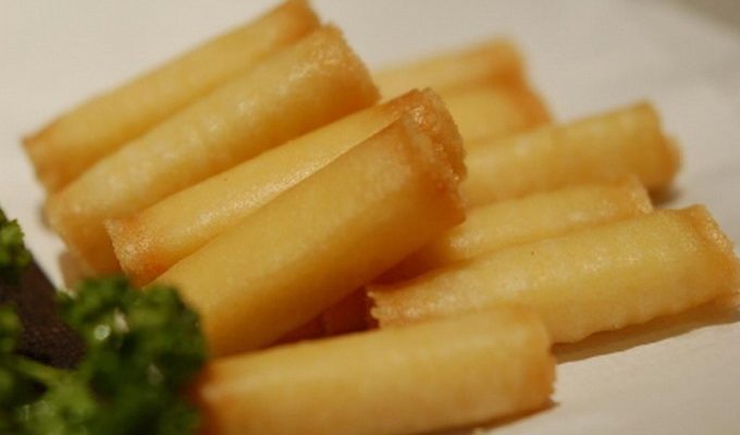 Τηγανίζουμε τα ρολλάκια ανά τρία ,για 2 λεπτά, το πολύ, γυρίζοντας τα διαρκώς μέσα στο λάδι, μέχρι να χρυσίσουν και να γίνουν τραγανά ,αλλά όχι να σκουρύνουν.