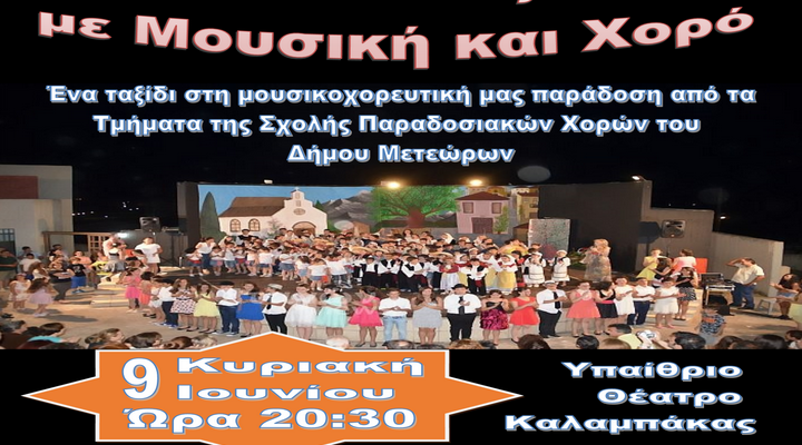 Τα χορευτικά τμήματα της Σχολής Παραδοσιακών Χορών του Δήμου Μετεώρων θα ταξιδέψουν στην μουσικοχορευτική μας παράδοση, ξαναζώντας τα παλιά, ώστε να πάρουμε τα εφόδια προκειμένου να συνεχίσουμε αυτό το αέναο ταξίδι στο χρόνο που ο Έλληνας έχει στιγματίσει με τρόπο μοναδικό. Αυτό το ταξίδι θα ξεκινήσει την Κυριακή 09-06-2019 και ώρα 20.30, στο Υπαίθριο Θέατρο Καλαμπάκας. Σας περιμένουμε όλους και όλες να χαρούμε και να καμαρώσουμε μικρούς και μεγάλους σ΄αυτή την προσπάθεια, δίνοντας το καλύτερο χειροκρότημα που τόσο χρειάζονται.