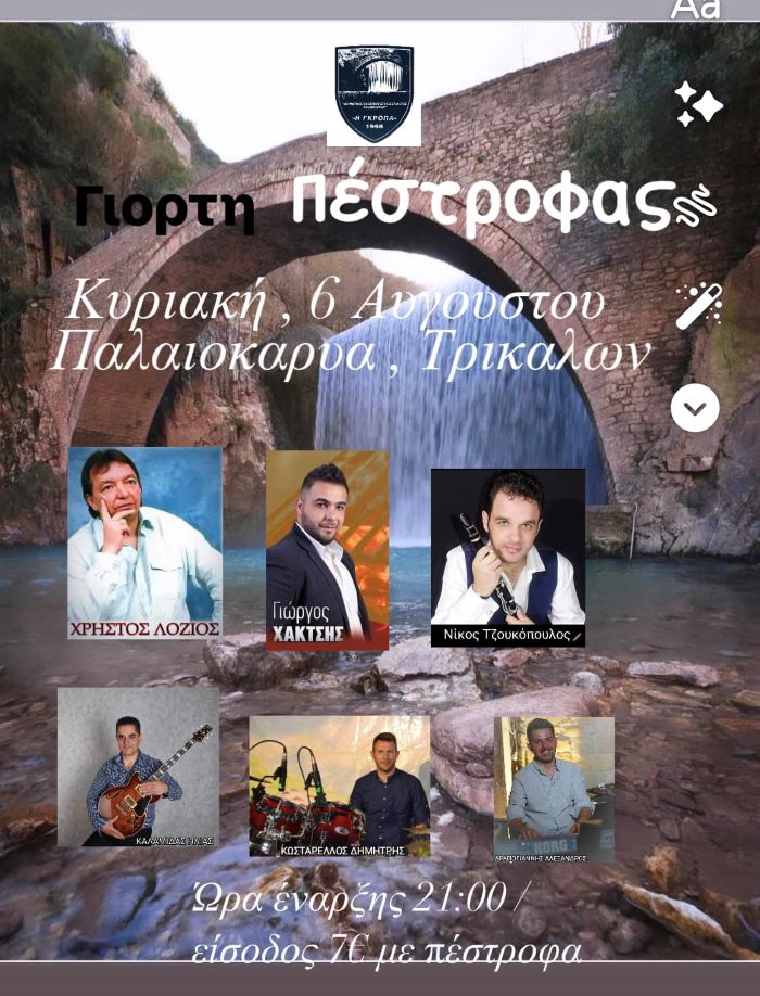 Γιορτή πέστροφας την Κυριακή στη Παλαιοκαρυά 04/08/2023 Τοπικά - Θεσσαλικά Δημήτρης Παδιός Γιορτή πέστροφας την Κυριακή 6 Αυγούστου στη Παλαιοκαρυά Ωρα έναρξης 21:00 Τιμή εισόδου 7 ευρώ με πέστροφα Ειδήσεις σήμερα Χρήστος Πούλιος: Μια τοποθέτηση με αιχμές για την ηγεσία του Υπουργείο Προστασίας του Πολίτη, της ΕΛΑΣ και των συνδικαλιστών 03.02.2026 Ηλιάδης ακίνητα: Πωλείται πολυτελής νεόδμητη μεζονέτα στη περιοχή της Μπάρας 03.02.2026 Κώστας Παπανώτας: Το τσάμπα που πέθανε και οι «τσάμπα μάγκες» 03.02.2026 Δείτε όλες τις τελευταίες Ειδήσεις από την Ελλάδα και τον Κόσμο, τη στιγμή που συμβαίνουν, στο trikalain.gr