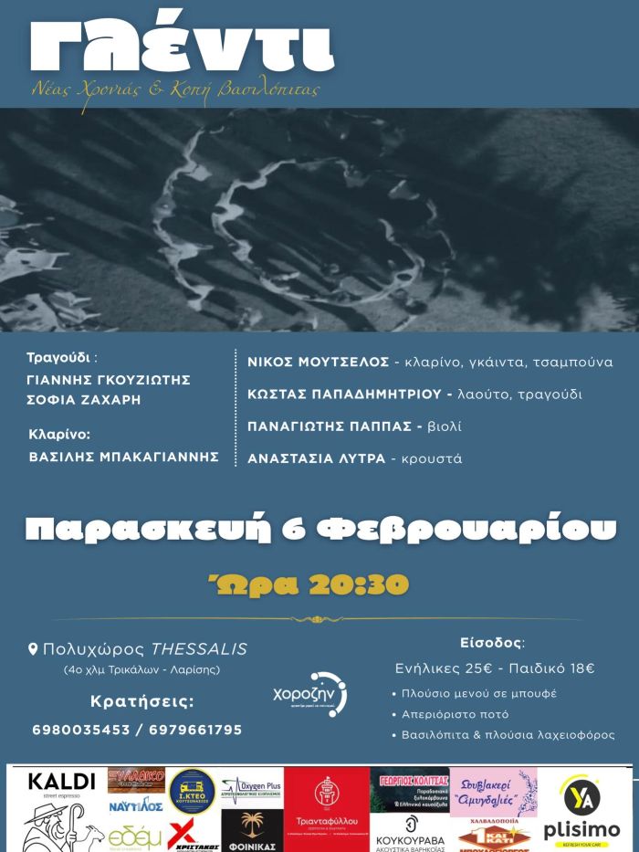 Το εργαστήρι χορού και πολιτισμού νομού Τρικάλων “Χοροζήν”, διοργάνωνει την Παρασκευή 6 Φεβρουαρίου 2026 και ώρα 20.30 μ.μ. στον Πολυχώρο Thesallis γλέντι για τη νέα χρονιά και κοπή βασιλόπιτας, με την συμμετοχή δημοτικής ορχήστρας με καταξιωμένους μουσικούς και τραγουδιστές.