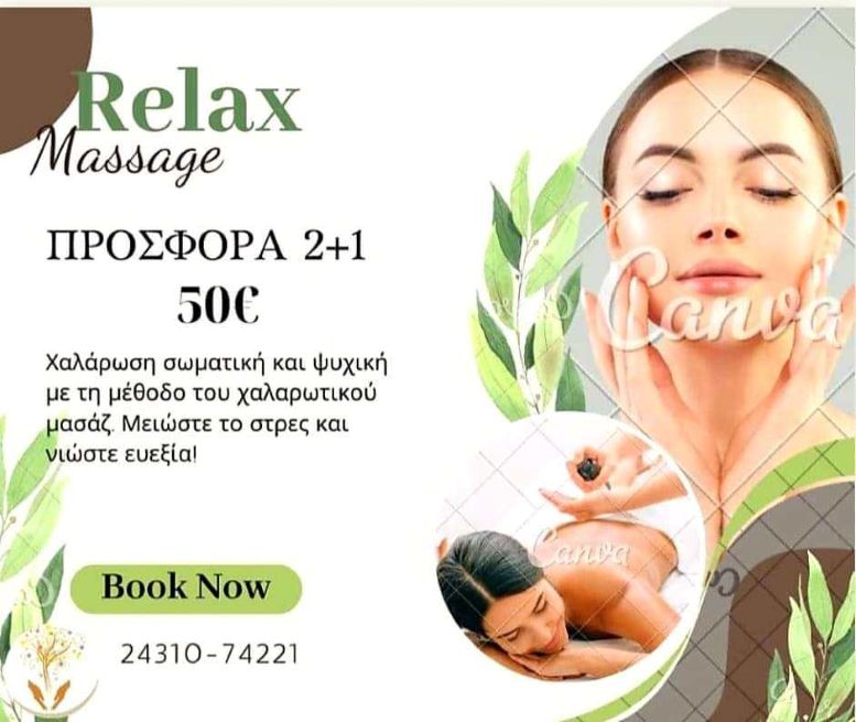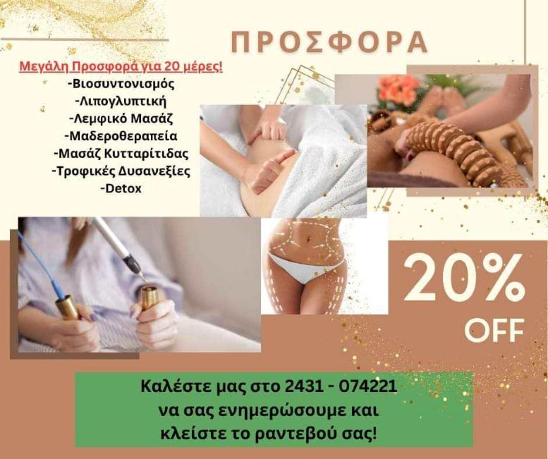 Επωφεληθείτε σήμερα κιόλας από τις μεγάλες προσφορές σε relax μασάζ, λεμφικό μασάζ, μαδεροθεραπεία, λιπογλυπτική, βιοσυντονισμό, μασάζ κυτταρίτιδας, τροφικές δυσανεξίες, detox κλπ.