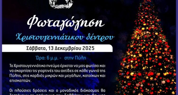 Το Σάββατο 13 Δεκεμβρίου, στις 6 μ.μ. θα γίνει η φωταγώγηση του χριστουγεννιάτικου δέντρου στην Πύλη, δίνοντας το έναυσμα για την έναρξη της γιορτινής περιόδου.