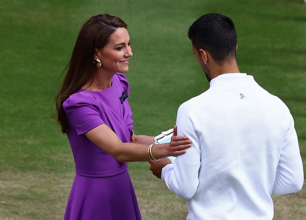 Η πριγκίπισσα της Ουαλίας, 42 ετών, μπήκε στο Centre Court στις 14 Ιουλίου μετά τον τελικό του απλού ανδρών μεταξύ του Κάρλος Αλκαράθ από την Ισπανία και του Νόβακ Τζόκοβιτς από τη Σερβία, απονέμοντας τα βραβεία στους αθλητές ως προστάτιδα του All England Lawn Tennis and Croquet Club.