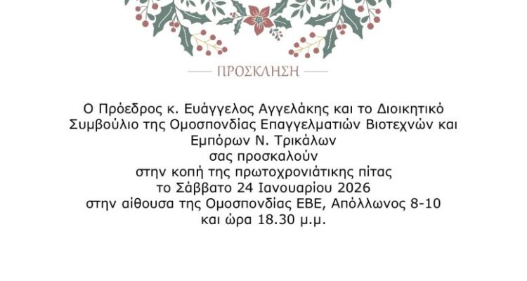 Η ΟΕΒΕ Τρικάλων κόβει την πίτα 22/01/2026 Uncategorized Δημήτρης Παδιός H Ομοσπονδία Επαγγελματιών Βιοτεχνών Και Εμπόρων Ν. Τρικάλων κόβει την πίτα το Σάββατο 24 Ιανουαρίου 2026 Ειδήσεις σήμερα Γ. Ραγκούσης: Μία μικρή επανάσταση για την Αποκρατικοποίηση της ζωής μαςΗλίας Φιλοκώστας: Το Περτούλι είναι το…Νταβός της ΕλλάδαςEφυγε από τη ζωή η Ουρανία Τανού Δείτε όλες τις τελευταίες Ειδήσεις από την Ελλάδα και τον Κόσμο, τη στιγμή που συμβαίνουν, στο trikalain.gr