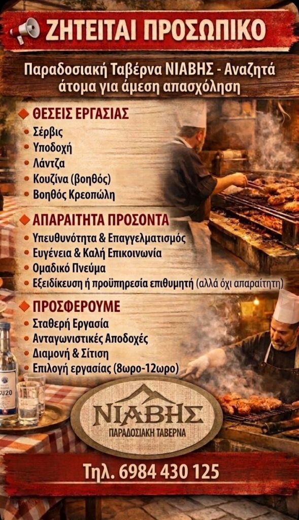Η παραδοσιακή ταβέρνα “Νιαβής” στο Νεραϊδοζώρι ζητά προσωπικό 18/04/2026 Τοπικά - Θεσσαλικά Δημήτρης Παδιός Η παραδοσιακή ταβέρνα “Νιαβής” στο Νεραϊδοζώρι ζητά προσωπικό Slider Posts Γ. Οικονόμου: Σειρά έχει ο Κυριάκος Μητσοτάκης 18.04.2026 Τρίκαλα: Ημέρα τιμής και μνήμης η σημερινή για τους 5 Επονίτες 18.04.2026 Market Pass 2026: Οι δικαιούχοι, τα ποσά έως 1.200€ και οι ημερομηνίες πληρωμής 18.04.2026 Ειδήσεις σήμερα ΣΥΡΙΖΑ Προοδευτική Συμμαχία Τρικάλων: 82 χρόνια από το αποτρόπαιο έγκλημα 18.04.2026 Διπλή Αγωνιστική Δράση & Πολυδιάστατη Παρουσία για τον ΣΟΑΤ! 18.04.2026 Koντοτόλη: Σοβαρές ελλείψεις προσωπικού στην Πυροσβεστική Υπηρεσία Καλαμπάκας ενόψει καλοκαιρινής περιόδου 18.04.2026 Δείτε όλες τις τελευταίες Ειδήσεις από την Ελλάδα και τον Κόσμο, τη στιγμή που συμβαίνουν, στο trikalain.gr