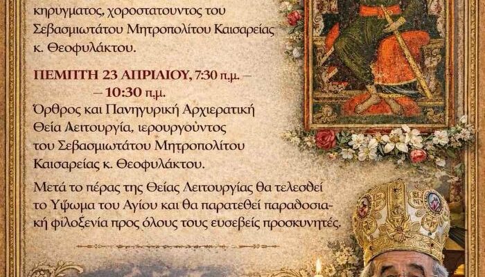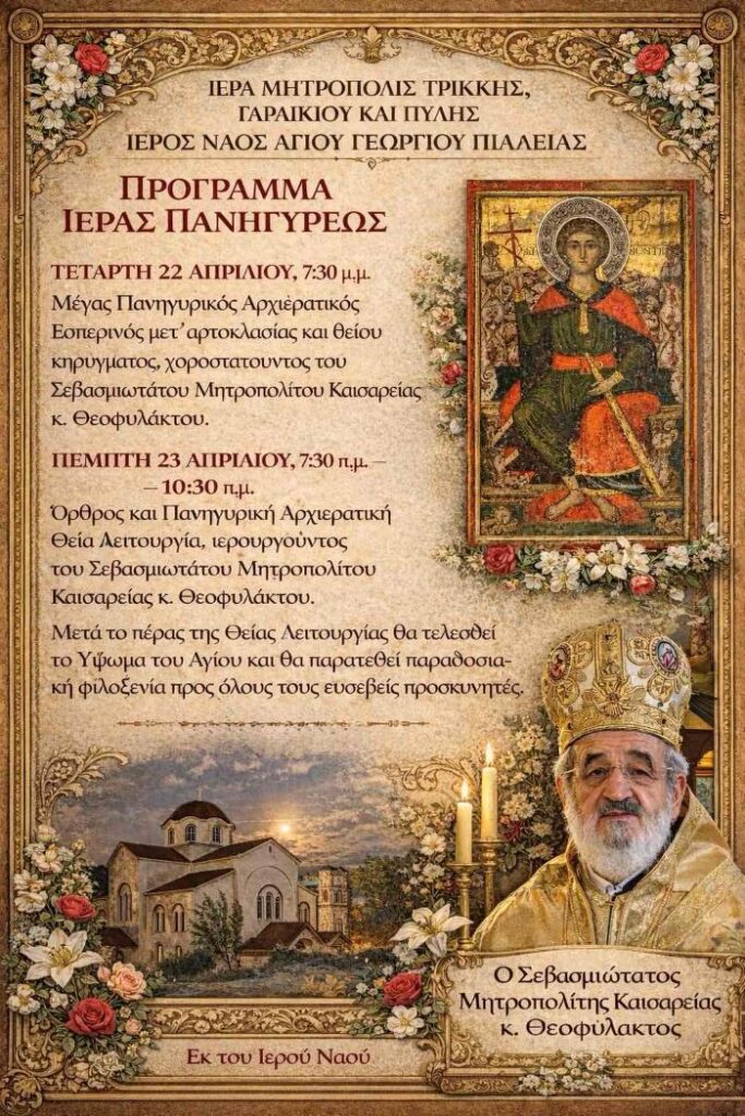 Η Ενορία του Αγίου Γεωργίου Πιάλειας πανηγυρίζει την ιερά μνήμη του ενδόξου Μεγαλομάρτυρος Αγίου Γεωργίου του Τροπαιοφόρου και προσκαλεί το φιλέορτο πλήρωμα να συμμετάσχει στις ιερές ακολουθίες της πανηγύρεως.