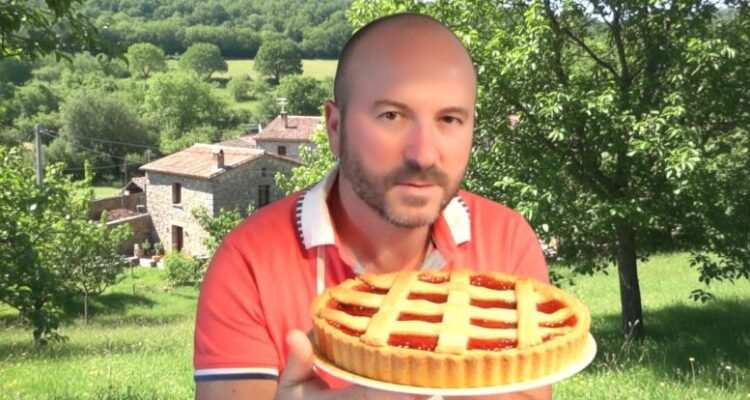 - Στρώνεις τις λωρίδες πάνω από τη μαρμελάδα σε σχήμα ρόμβων ή σταυρωτά (πλέγμα). Πιέζεις τις άκρες για να ενωθούν με τη βάση.