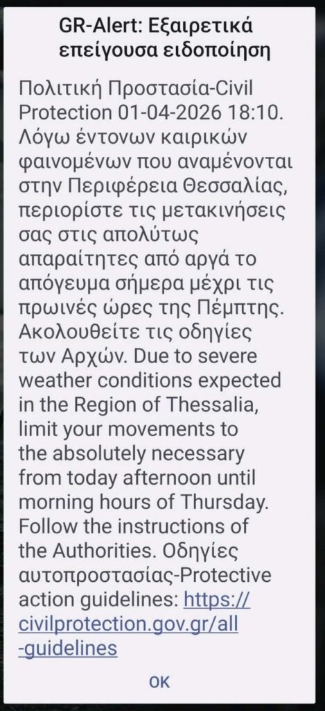 Μήνυμα στα κινητά τους τηλέφωνα έλαβαν το απόγευμα της Τετάρτης οι Τρικαλινοί από το 112, με τη Διεύθυνση Πολιτικής Προστασίας να προειδοποιεί για επικίνδυνα καιρικά φαινόμενα σε όλη την Θεσσαλία.