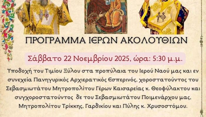 και θα συλλειτουργήσει μετά του Σεβασμιωτάτου Ποιμενάρχου μας, Μητροπολίτου Τρίκκης, Γαρδικίου και Πύλης κ. Χρυσοστόμου.
