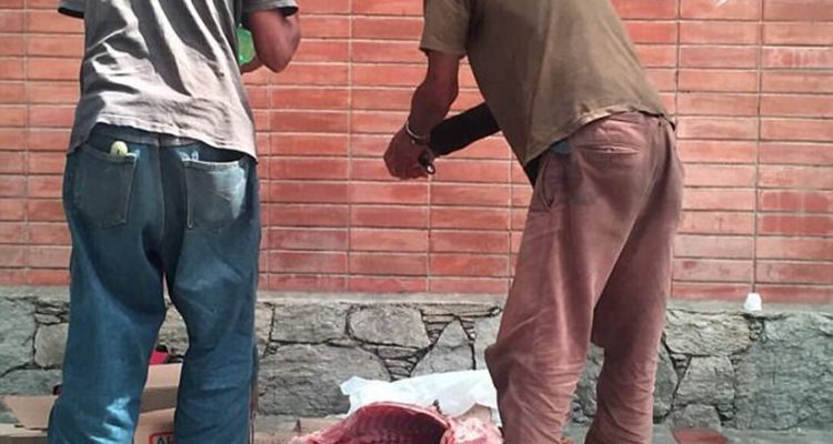 Φωτογραφίες που κάνουν τον γύρο του διαδικτύου αυτήν την εβδομάδα δείχνουν δύο άνδρες στο Καράκας να γδέρνουν και να κόβουν σε κομμάτια έναν σκύλο στο δρόμο, όπως πιστεύεται για να τον φάνε.