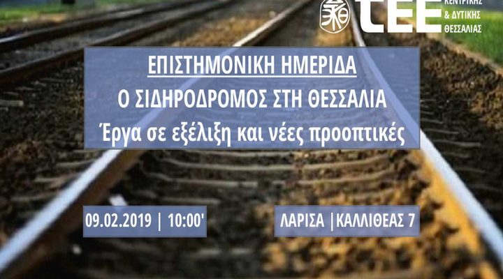 Tο Περιφερειακό Τμήμα Κεντρικής & Δυτικής Θεσσαλίας του Τεχνικού Επιμελητηρίου Ελλάδος διοργανώνει επιστημονική ημερίδα με θέμα «Ο Σιδηρόδρομος στη Θεσσαλία – Έργα σε εξέλιξη και νέες προοπτικές», στη Λάρισα, το Σάββατο 9 Φεβρουαρίου 2019 και ώρα 10:00, στο ΤΕΕ, (Καλλιθέας 7, αίθουσα «Ιωάννης Βαρνάς», 3ος όροφος).