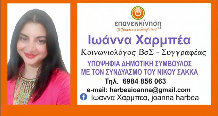 Ιωάννα Χαρμπέα κοινωνιολόγος/συγγραφέας υποψήφια δημοτική σύμβουλος με την παράταξη του Νίκου Σακκά Επανεκκίνηση vol3