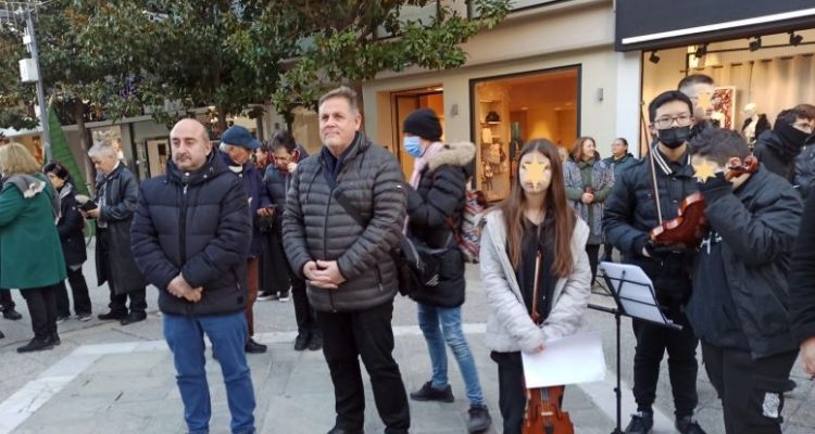 Η ορχήστρα του σχολείου έπαιξε γνώριμες μελωδίες και κάλαντα των εορτών, πλημμυρίζοντας με νότες τον πεζόδρομο της Ασκληπιού.