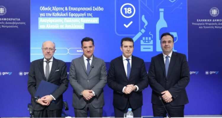 Οι Υπουργοί Υγείας Άδωνις Γεωργιάδης, Ψηφιακής Διακυβέρνησης και Τεχνητής Νοημοσύνης Δημήτρης Παπαστεργίου, Προστασίας του Πολίτη Μιχάλης Χρυσοχοΐδης και ο Υφυπουργός Υγείας Δημήτρης Βαρτζόπουλος παραχώρησαν σήμερα, Τετάρτη 18 Μαρτίου 2026, Συνέντευξη Τύπου στο Υπουργείο Ψηφιακής Διακυβέρνησης και ΤΝ, παρουσιάζοντας τον «Οδικό Χάρτη και το Επιχειρησιακό Σχέδιο για την Καθολική Εφαρμογή της Απαγόρευσης Πώλησης Καπνικών Προϊόντων και Αλκοόλ σε Ανήλικους».