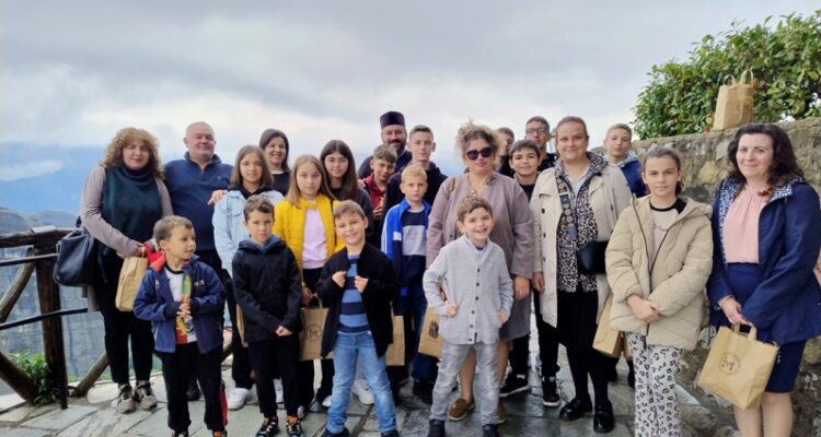 Στην Ιερά Μονή Μεγάλου Μετεώρου, ο Καθηγούμενος αυτής Αρχιμανδρίτης π. Νήφων Καψάλης και Πρωτοσύγκελλος της Ιεράς Μητροπόλεως μας, αν και απουσίαζε, φρόντισε για όλα. Οι υπάλληλοι της Ιεράς Μονής μας υποδέχτηκαν με μεγάλη χαρά και μας προσέφεραν φιλοξενία. Μας ξενάγησαν στο Καθολικό της Μονής, εξιστορώντας μας την ιστορία του μοναστηριού, θαυμάσαμε τα χειρόγραφα, τα άμφια και τα ιερά σκεύη στο αξιοθαύμαστο μουσείο και βγάλαμε φωτογραφίες. Τα παιδιά παρακολουθούσαν με ιδιαίτερο ενδιαφέρον. Σε όλα τα παιδιά προσφέρθηκε μία σακούλα με μπισκότα, εικονίτσες και διάφορα άλλα. Όλοι απολαύσαμε την πραγματικά όμορφη εκδρομή και το ιερό αυτό προσκύνημα στα δικά μας άγια μέρη.