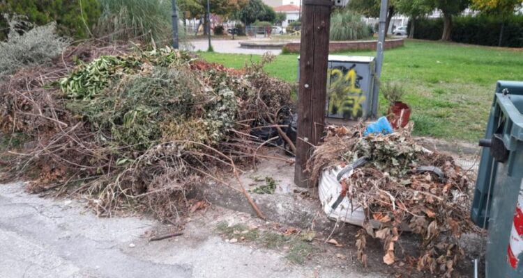 Δύο καί περισσότερες βδομάδες είναι τα κλαδιά καί τα σκουπίδια στο πεζοδρόμιο της οδού Σύρου, στό ύψος πού τελειώνει η οδός Λευκάδας, κοντά στο Γενικό Νοσοκομείο Τρικάλων.
