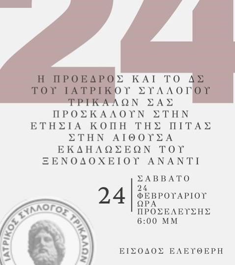 Κοπή πίτας για τα μέλη του Ιατρικού Συλλόγου Τρικάλων 19/02/2024 Τοπικά - Θεσσαλικά Δημήτρης Παδιός Το Σάββατο 24 Φεβρουαρίου η Κοπή πίτας του Ιατρικού Συλλόγου Τρικάλων αποκλειστικά για τα μέλη του . Η εκδήλωση θα πραγματοποιηθεί στο Ξενοδοχείο ΑΝΑΝΤΙ , ΏΡΑ προσέλευσης 6.00μμ. Ειδήσεις σήμερα Eφυγε από τη ζωή ο Νικόλαος Λάζος 02.02.2026 Το εμβόλιο του Κουρέτα, η ασθένεια της Κοντοτόλη, οι εξηγήσεις Καταβούτα, το απαγορευτικό Σακκά, η κάλυψη στον Παπαστεργίου και Μαράβας ο χιονοφάγος! 02.02.2026 Ξαναπλημμύρισε ο οικισμός Τρίκκη- Στο ίδιο έργο θεατές! 01.02.2026 Δείτε όλες τις τελευταίες Ειδήσεις από την Ελλάδα και τον Κόσμο, τη στιγμή που συμβαίνουν, στο trikalain.gr