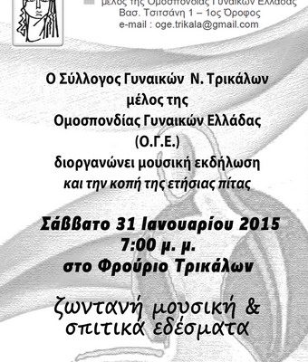 O Σύλλογος Γυναικών N. Τρικάλων μέλος της Ομοσπονδίας Γυναικών Ελλάδας (Ο.Γ.Ε.) διοργανώνει μουσικοχορευτική εκδήλωση με αφορμή την κοπή της Πρωτοχρονιάτικης πίτας. Η εκδήλωση θα πραγματοποιηθεί στο Φρούριο το Σάββατο 31 Ιανουαρίου 2015 στις 7:00 το απόγευμα και θα περιλαμβάνει ζωντανή μουσική, χορό και σπιτικά εδέσματα.