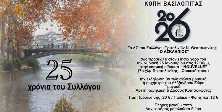 Κοπή πίτας του συλλόγου Τρικαλινών Θεσσαλονίκης ” Ασκληπιός” 23/01/2026 Απόψεις Δημήτρης Παδιός Την πίτα τους κόβουν την Κυριακή 25 Ιανουαρίου 2026 και ώρα 12.30 μ.μ. στην κοσμική αίθουσα NOUVELLE, οι Τρικαλινοί που διαμένουν στην Θεσσαλονίκη. Ειδήσεις σήμερα ΛΕΣΧΗ ΦΙΛΩΝ ΒΕΣΠΑΣ ΤΡΙΚΑΛΩΝ: Εκδήλωση Κοπής Πρωτοχρονιάτικης ΒασιλόπιταςΗ εβδομαδιαία συνάντηση του συλλόγου των φίλων σιδηροδρόμου ΤρικάλωνΠέθανε ο Σπύρος Καρατζαφέρης Δείτε όλες τις τελευταίες Ειδήσεις από την Ελλάδα και τον Κόσμο, τη στιγμή που συμβαίνουν, στο trikalain.gr