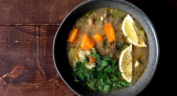 Σβήνουμε με το κρασί και προσθέτουμε τον χυμό από το λεμόνι. Μόλις εξατμιστεί το κρασί, βάζουμε το νερό, καλύπτουμε με το καπάκι και βράζουμε για 1 ½ ώρα. Στη συνέχεια, προσθέτουμε τα λαχανικά και το σέλινο. Καλύπτουμε ξανά με το καπάκι και σιγοβράζουμε για 20-30 λεπτά. Σερβίρουμε με φέτες λεμονιού, σέλινο, ελαιόλαδο και πιπέρι.
