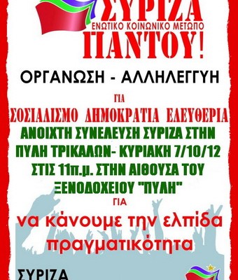 συνέλευση που θα πραγματοποιηθεί την Κυριακή 7/10 και ώρα 11:00 π.μ.στο Ξενοδοχείο «Πύλη» στην Πόρτα Παναγιά, στα πλαίσια της συγκρότησης του ΣΥΡΙΖΑ-ΕΚΜ σε ενιαίο πολιτικό φορέα.