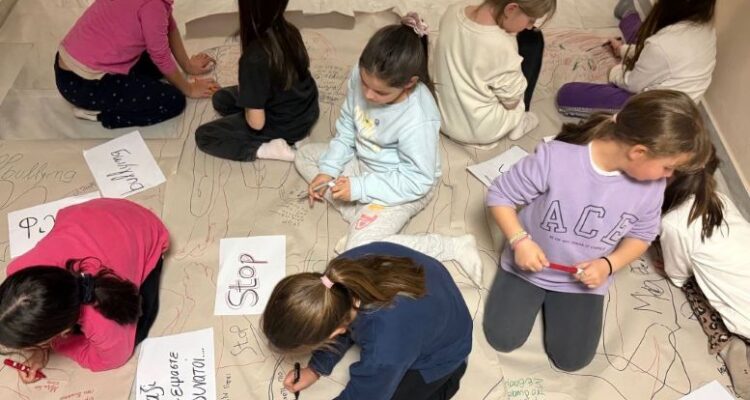 Σε μια συμβολική εικαστική παρέμβαση, τα παιδιά αποτύπωσαν πάνω σε ανθρώπινα περιγράμματα τις σκέψεις και τα συναισθήματα που γεννά η βία, αναδεικνύοντας πόσο βαθιά μπορεί να «εγγραφεί» μέσα μας μια πληγή. Παράλληλα, κατέγραψαν λέξεις και φράσεις που οι ίδιοι επέλεξαν ως απάντηση στον εκφοβισμό: