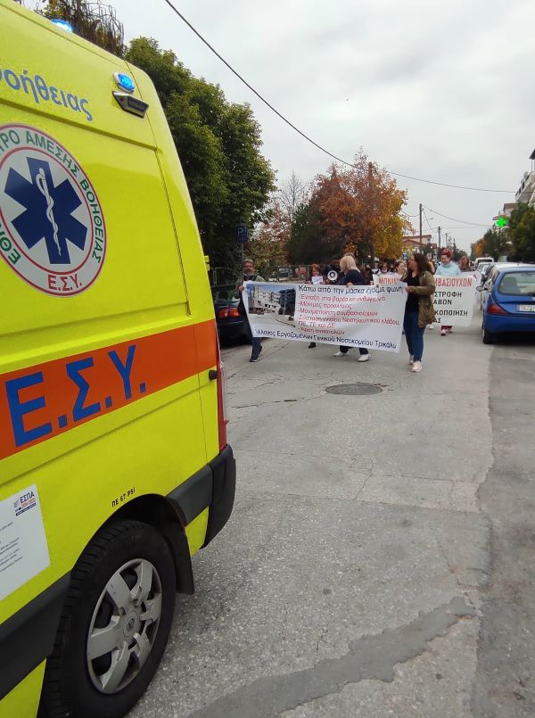 Όπως κατέγραψε το trikalaIN.gr, εντυπωσιακή ήταν η πεζή πορεία των υγειονομικών με την συμμετοχή του ΕΚΑΒ” από το Νοσοκομείο μέχρι την πλατεία Ρήγα Φεραίου, όπου έγινε η κεντρική συγκέντρωση.