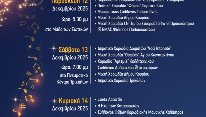 Ο Δήμος Τρικκαίων, η e-trikala και η οργανωτική επιτροπή του Μύλου των Ξωτικών φιλοξενούν και το 2025 πανελλήνιες χορωδιακές συναντήσεις. Με την επιμέλεια και επίβλεψη της Δημοτικής Χορωδίας Τρικάλων το τριήμερο 12, 13 και 14 Δεκεμβρίου 2025 πραγματοποιούνται: