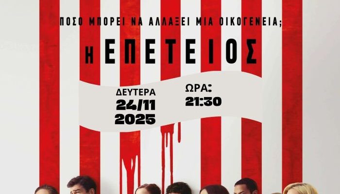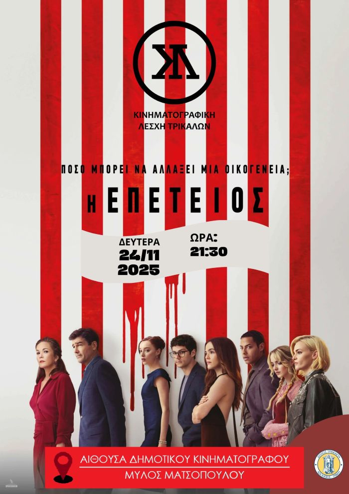 Με ταινία που παρακολουθεί τη σύγχρονη πολιτική κατάσταση στις ΗΠΑ, συνεχίζονται οι προβολές της Κινηματογραφικής Λέσχης Τρικάλων. Πρόκειται για την ταινία «Επέτειος», με σημαντικό καστ, που θα προβληθεί τη Δευτέρα 24 Νοεμβρίου 2025, στις 21:30 στο πλαίσιο της φετινής συνεργασίας με τον Δημοτικό Κινηματογράφο Τρικάλων.