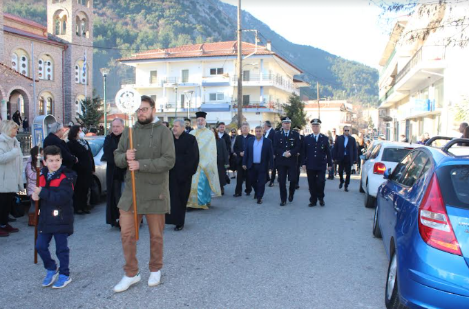 Ακολούθησε η λιτάνευση του Τιμίου Σταυρού με την επιβλητική πομπή λαού και κλήρου που κατευθύνθηκε προς το Πορταικό Ποταμό, όπου έγινε ο Αγιασμός των Υδάτων και η τελετή Κατάδυσης του Τιμίου Σταυρού.