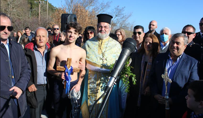Ακολούθησε η λιτάνευση του Τιμίου Σταυρού με την επιβλητική πομπή λαού και κλήρου που κατευθύνθηκε προς το Πορταικό Ποταμό, όπου έγινε ο Αγιασμός των Υδάτων και η τελετή Κατάδυσης του Τιμίου Σταυρού.