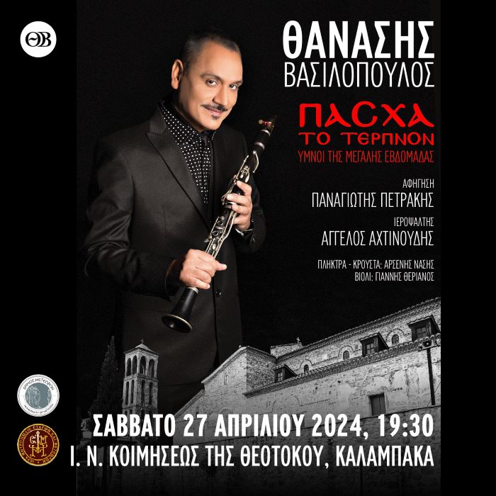 Με έμπνευση από τα έθιμα και το κατανυκτικό κλίμα των Άγιων Ημερών του Πάσχα, η Ιερά Μητρόπολη Σταγών και Μετεώρων και ο Δήμος Μετεώρων σας προσκαλούν να συμμετέχετε στην μεγάλη συναυλία «Πάσχα το Τερπνόν- Ύμνοι της Μεγάλης Εβδομάδας» υπό τους ήχους του δεξιοτέχνη του κλαρίνου Θανάση Βασιλόπουλου.