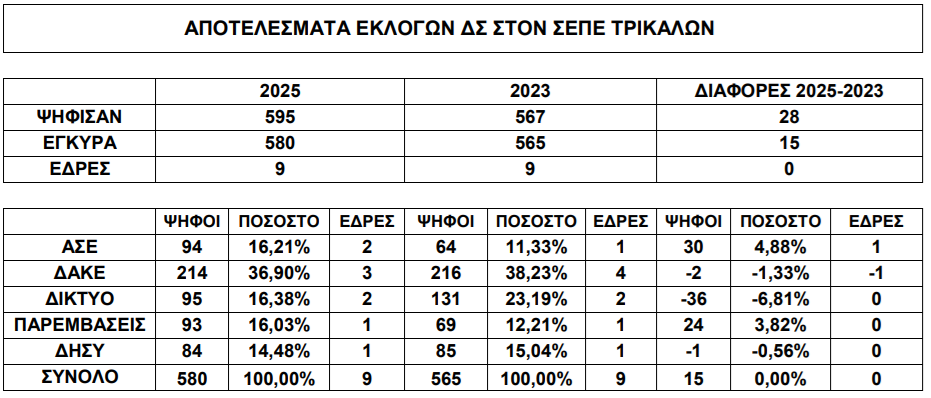 Μεγάλη άνοδος της ΑΣΕ στις εκλογές του ΣΕΠΕ Τρικάλων για το νέο ΔΣ!