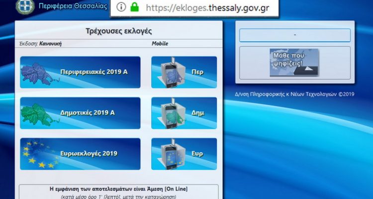 Από την Περιφέρεια Θεσσαλίας ανακοινώνεται ότι από το μηχανογραφικό σύστημά της θα εκδίδονται αποτελέσματα της εκλογικής διαδικασίας της 26ης Μαΐου 2019, για: