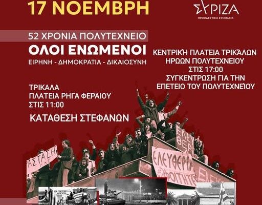 Καλούμε της νεολαία και όλους τους δημοκρατικούς πολίτες, να συμμετάσχουν μαζικά στις επετειακές εκδηλώσεις της 17ης Νοέμβρη, τις συγκεντρώσεις και τις πορείες που θα γίνουν σε όλες τις πόλεις της χώρας.